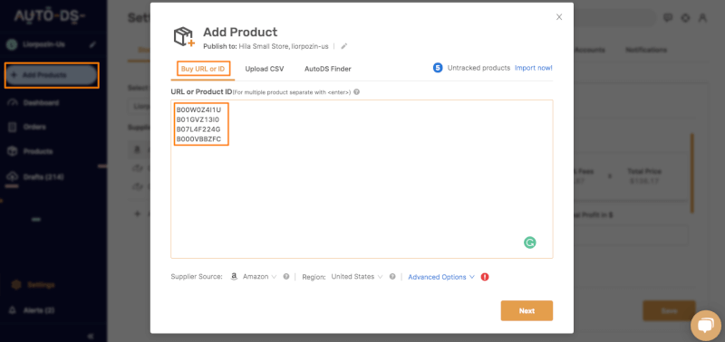 To do this, copy the product’s URL or ID from Amazon, and click on the ‘Add Products‘ button on the AutoDS page. Then, click the ‘Multiple Products / Stores’ option.