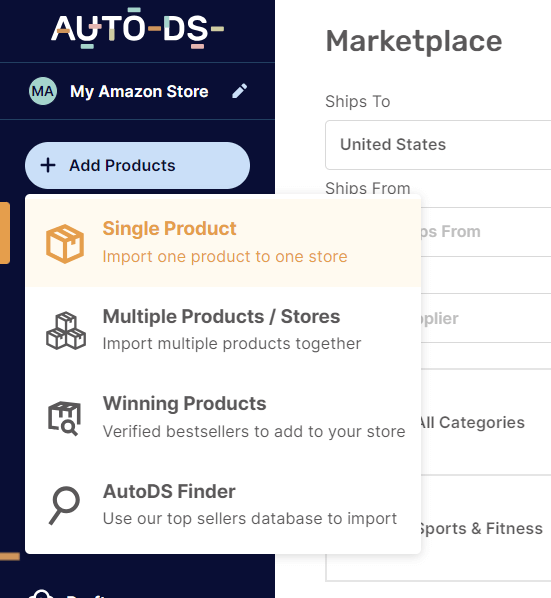 To demonstrate, let’s discuss one of the easiest ways to start importing products – the Single Product Uploader. Go to the AutoDS Marketplace click the ‘Add Product’ button on the top-left corner of the AutoDS Marketplace and select ‘Single Product.’ Next, click the ‘Add Product’ button on the top-left corner of the AutoDS Marketplace and select ‘Single Product.’