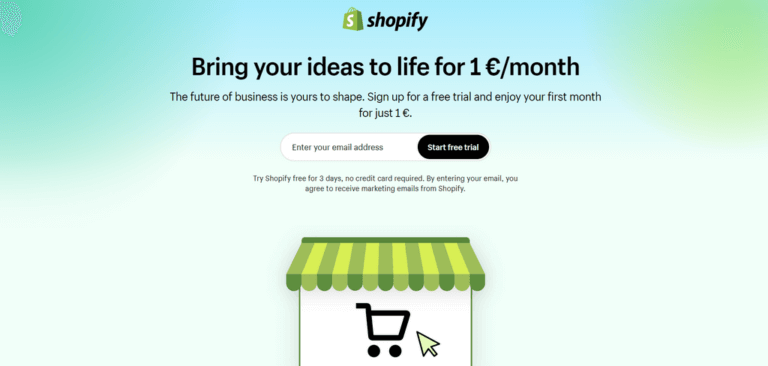 Starting your online store with Shopify is easy! Go to their website and click Start Free Trial to begin. They even offer a free trial and the first 3 months for $1/month on select plans (subject to change), so you can test it before committing.
