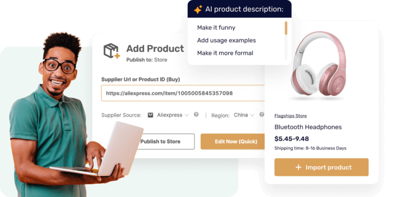 Import all product details, including variations, images, titles, descriptions, and product specifics from global suppliers in one click. Use AI to optimize product information.
